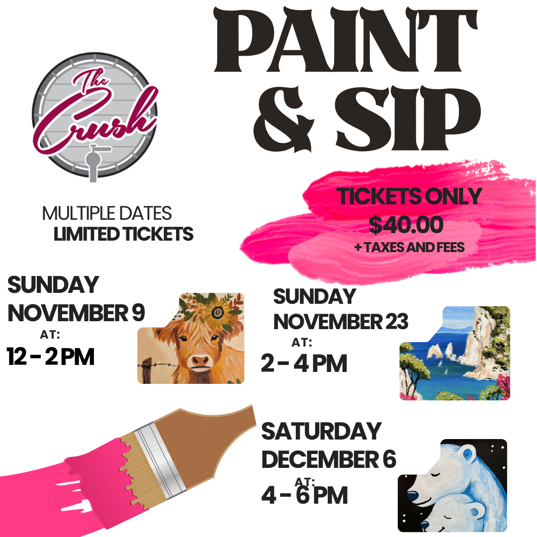 Join us at our tasting bar on Sunday November 9, Sunday November 23rd, and Saturday December 6 for our first ever Paint and Sip events!