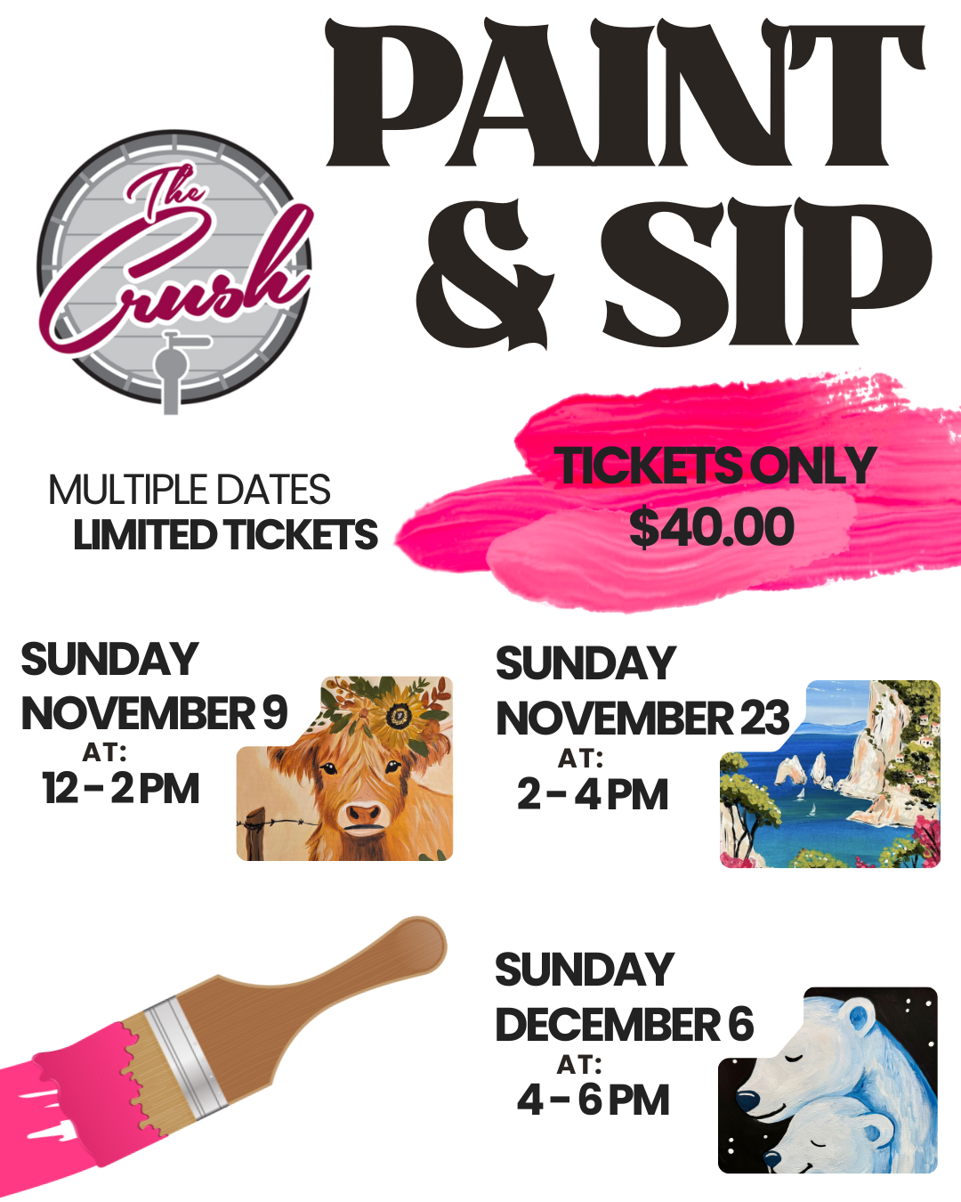 Join us at our tasting bar on Sunday November 9, Sunday November 23rd, and Sunday December 6 for our first ever Paint and Sip events!